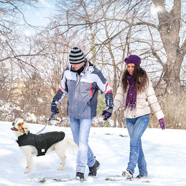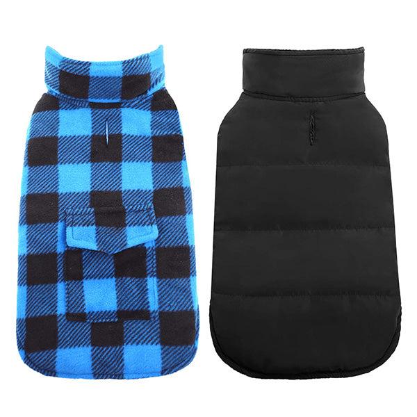 The winter vest apparel is made of high-quality polyester. TC (terylene/cotton) & polyester fiber. The fabric is waterproof. windproof. durable & breathable. Will keep your pet safe and warm during the cold weather. The dog winter jacket is for reversible wear. with the magic sticker closures around the neck & belly that can easily adjust the size to fit your dog and are easy to wear and take off.