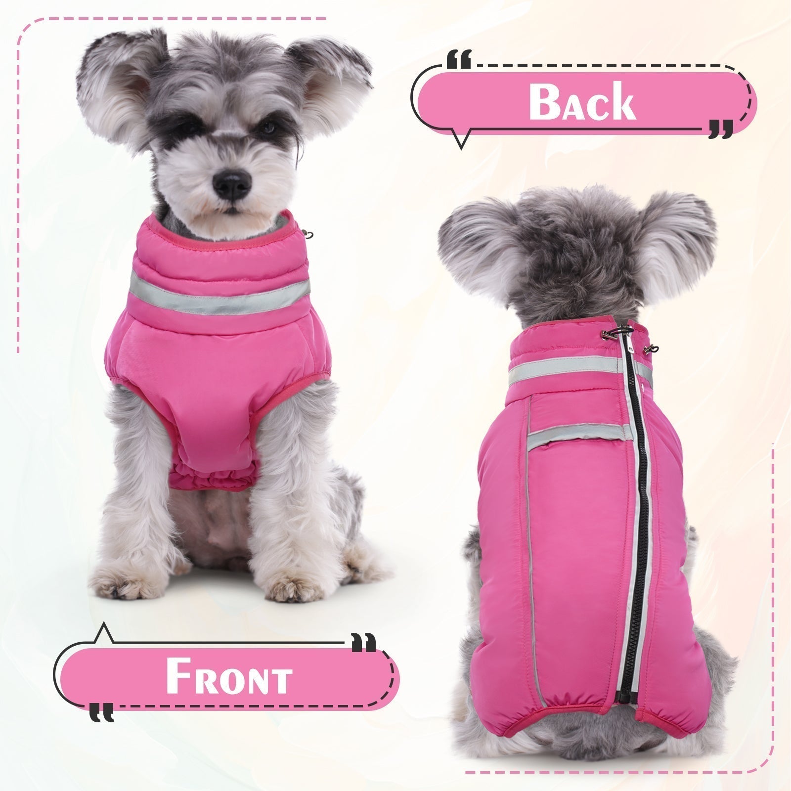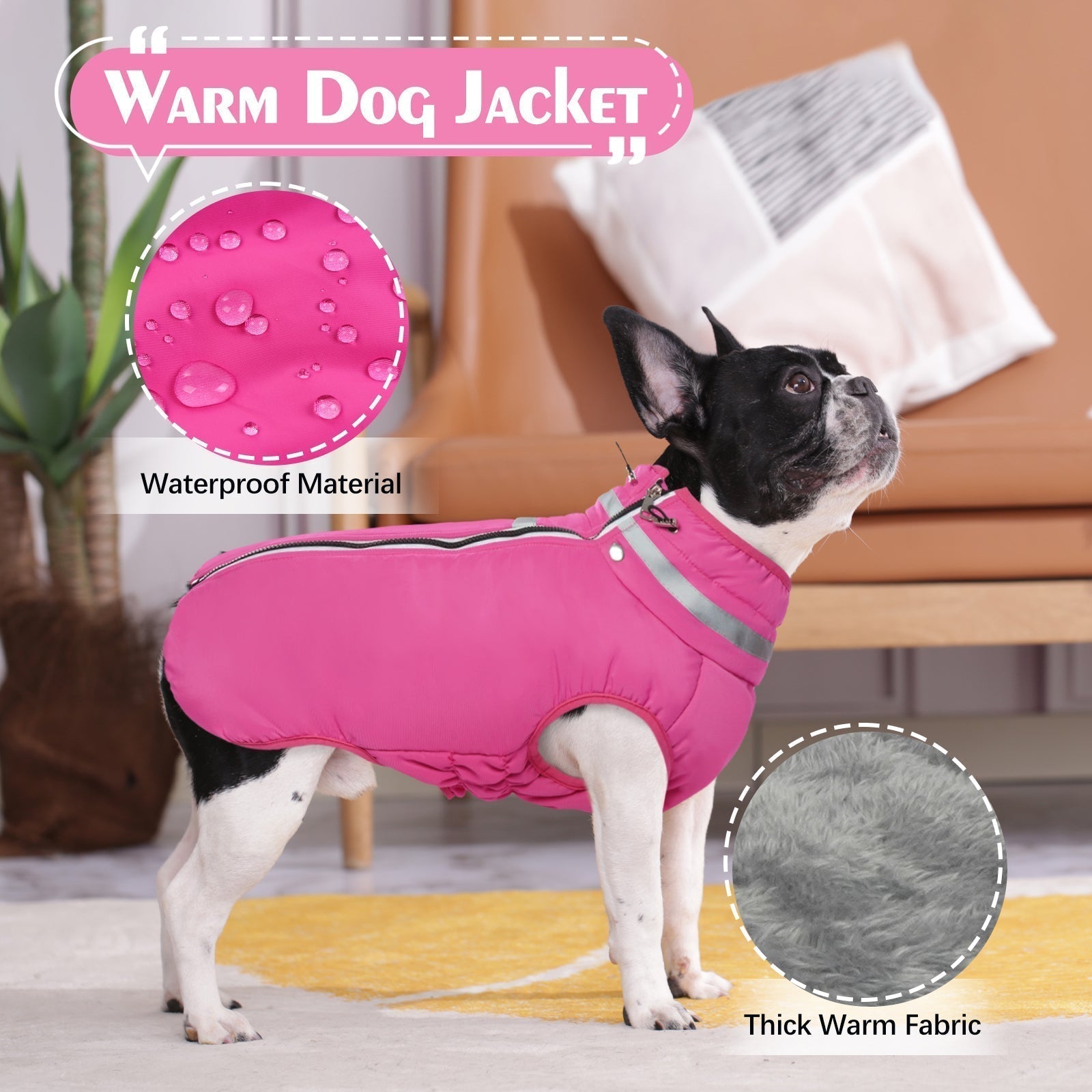 Adjustable and Snug Fit Dog Winter Jacket: This dog coat features a collar with a drawstring. allowing you to customize the fit around your dog's neck. Additionally. the back of the dog winter coat is equipped with a leash attachment adorned with reflective strips.